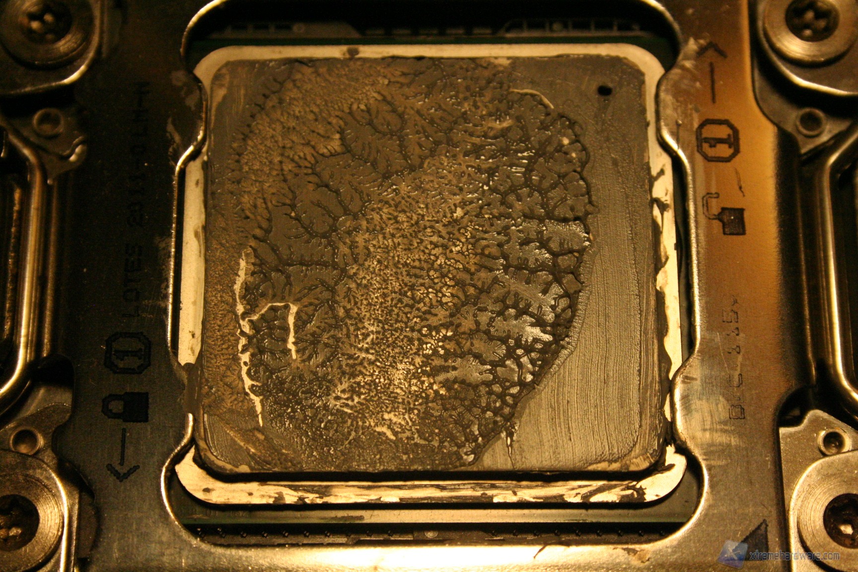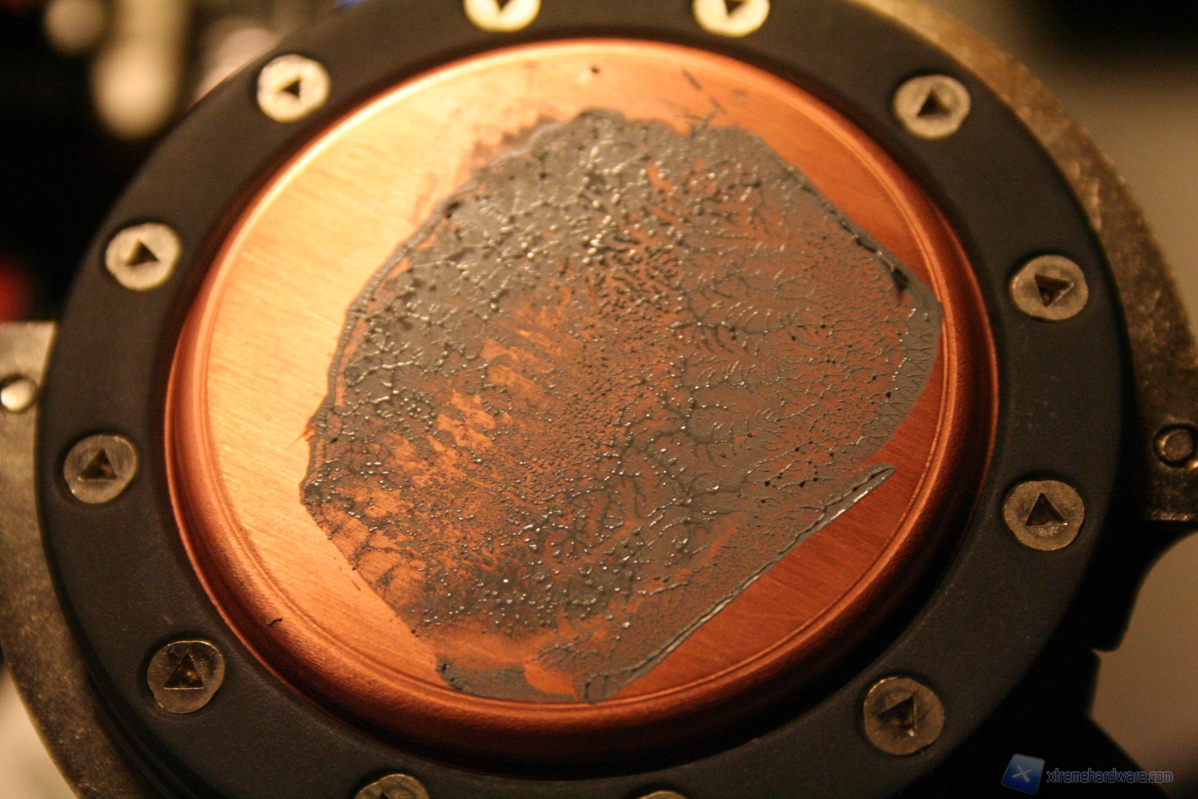 Un particolare della pasta termica applicata; potrebbe sembrare troppa, ma data la leggera rugosità della base, che non è lappata a specchio, come vedrete anche dai test termici il risultato è eccellente. Oltre a questo vi mostriamo anche il contatto con la base: